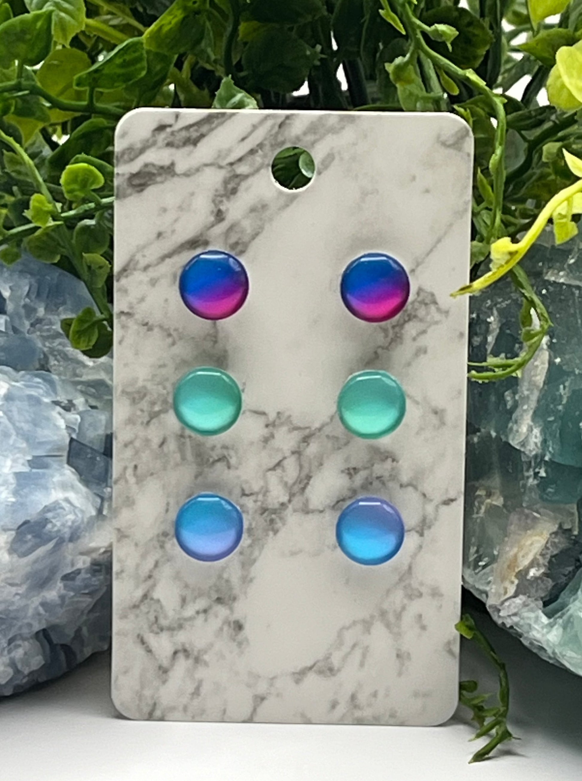 3 pair pack of 10 mm hypoallergenic surgical steel stud earrings. Super cute color fade designs that will add a little fun to any outfit. Lightweight and very comfortable.