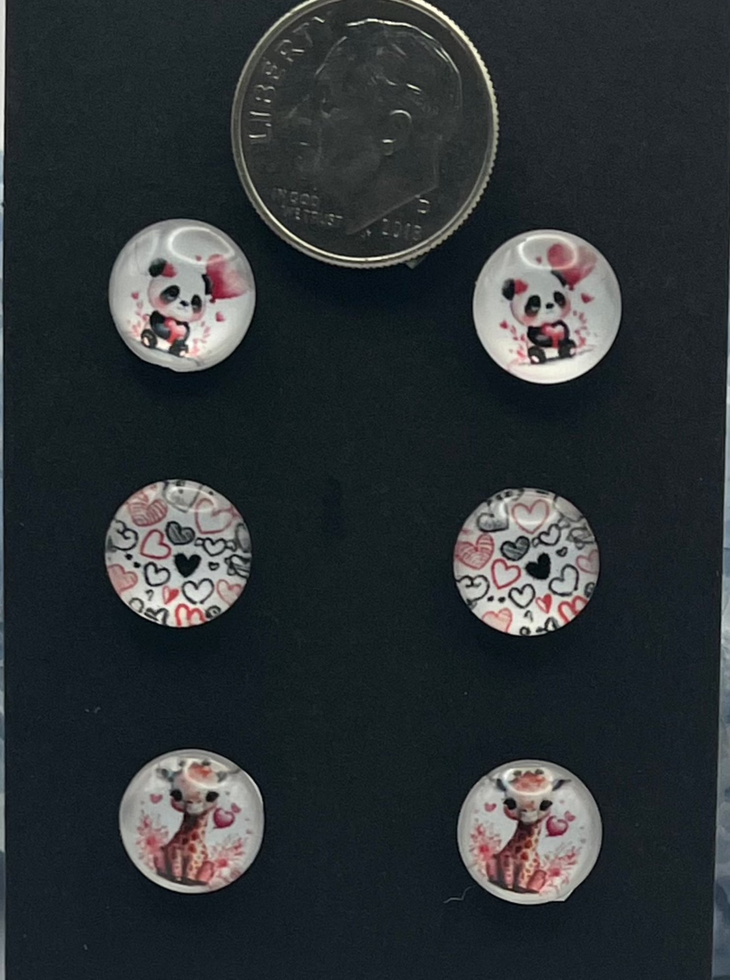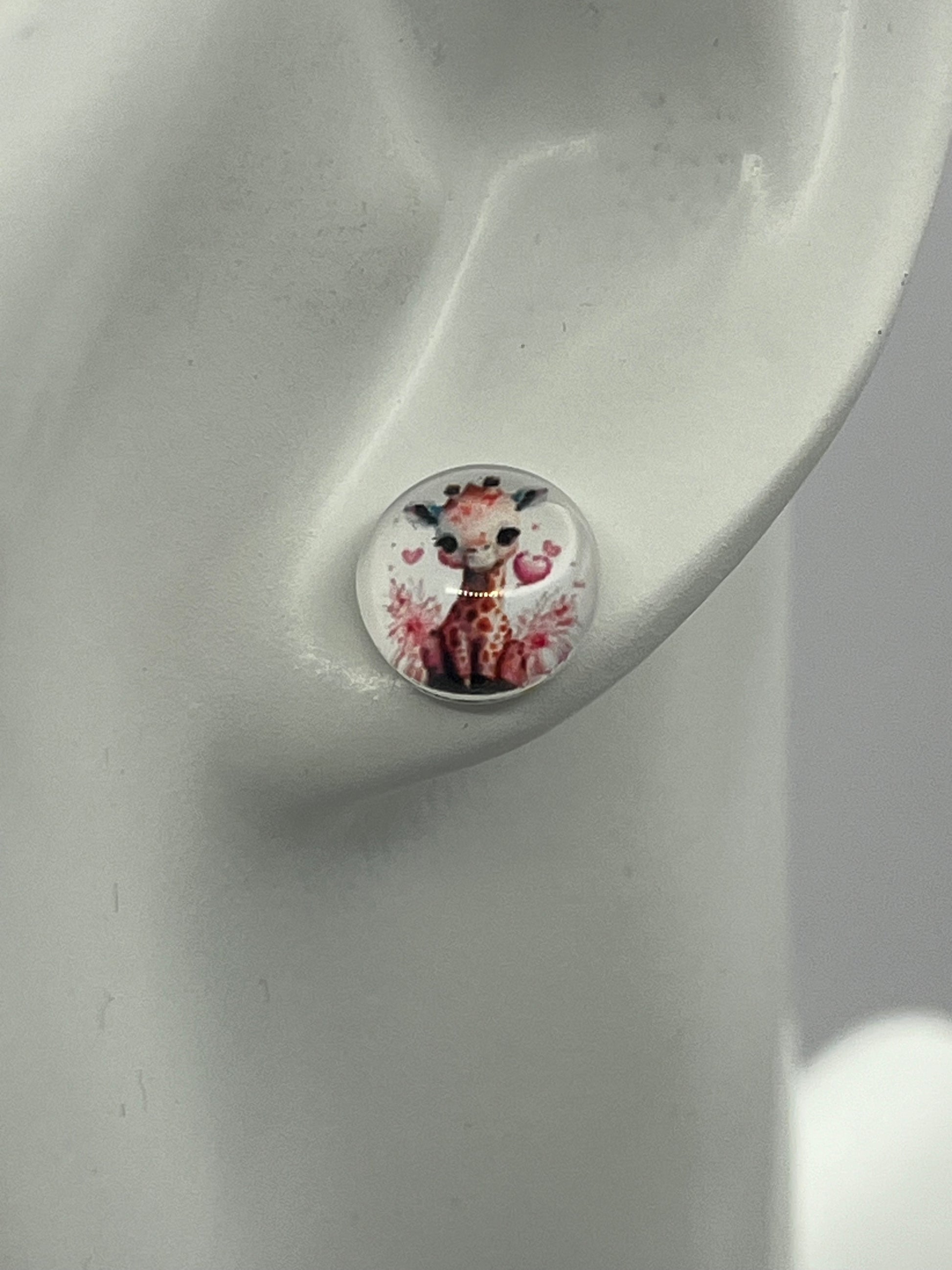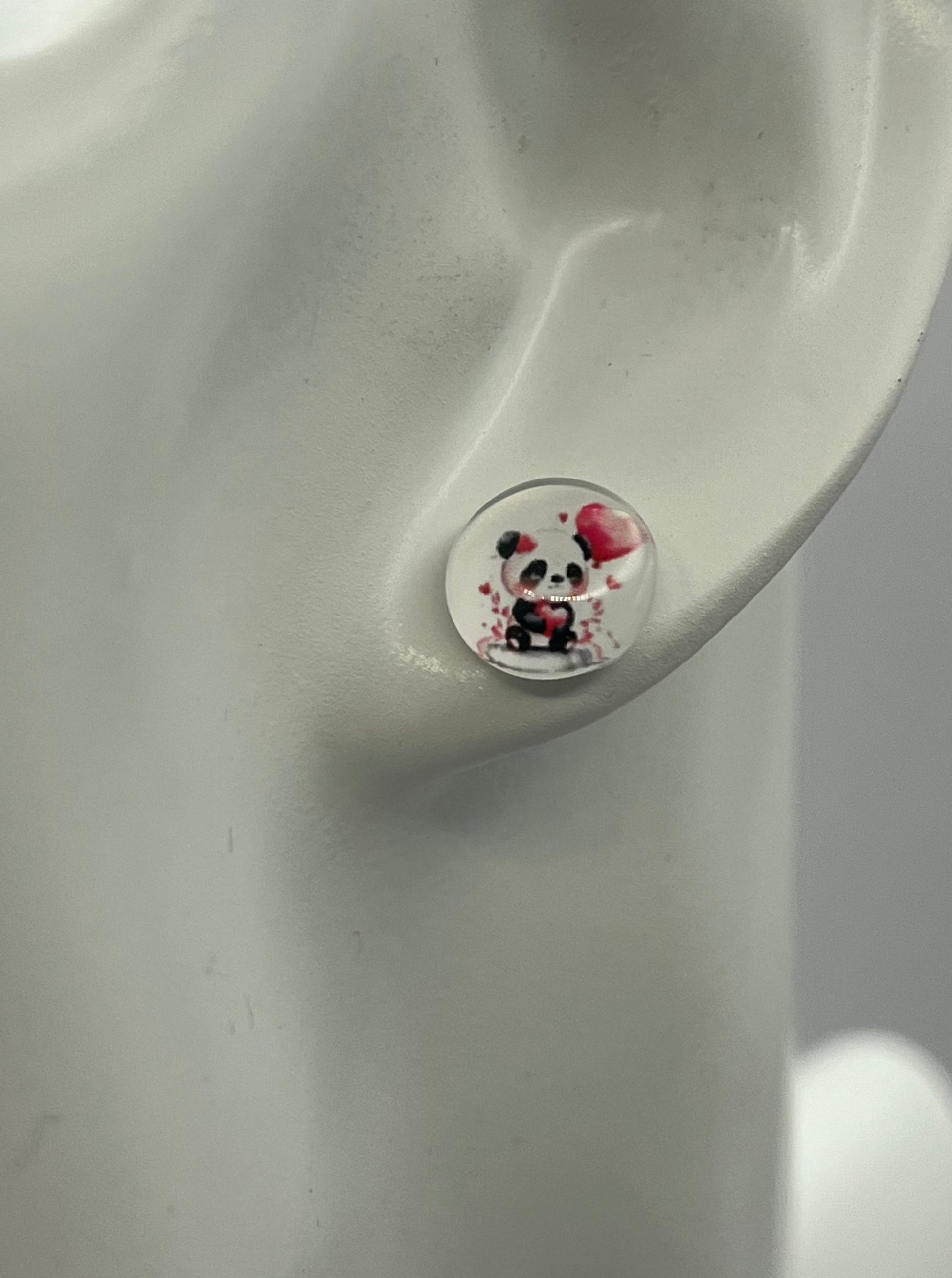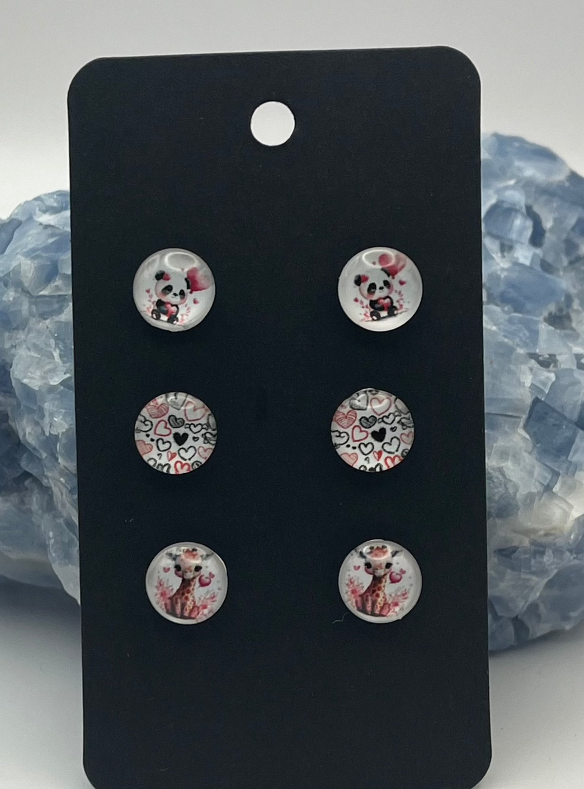 3 pair pack of 10 mm hypoallergenic surgical steel stud earrings. Super cute giraffe, panda, and heart set that will add a little fun to any outfit. Lightweight and very comfortable.
