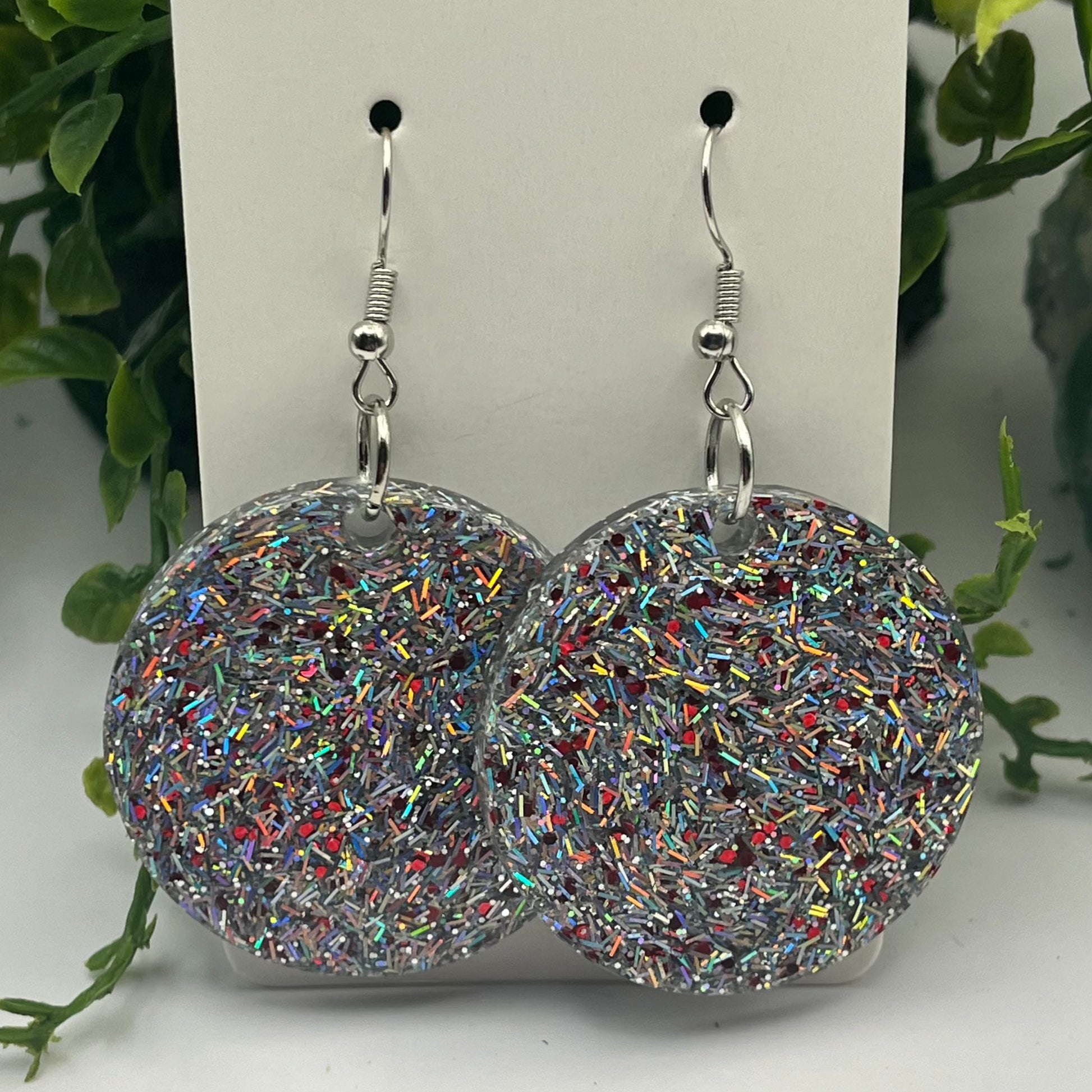 They are large circles with a base of iridescent silver glitter with a sprinkle of bright red. Dimensions: Length 1.5" Width 1.5" Total Drop Length with hook 2.5. They are made with resin, super cute glitter mix, and stainless-steel hypoallergenic hooks.