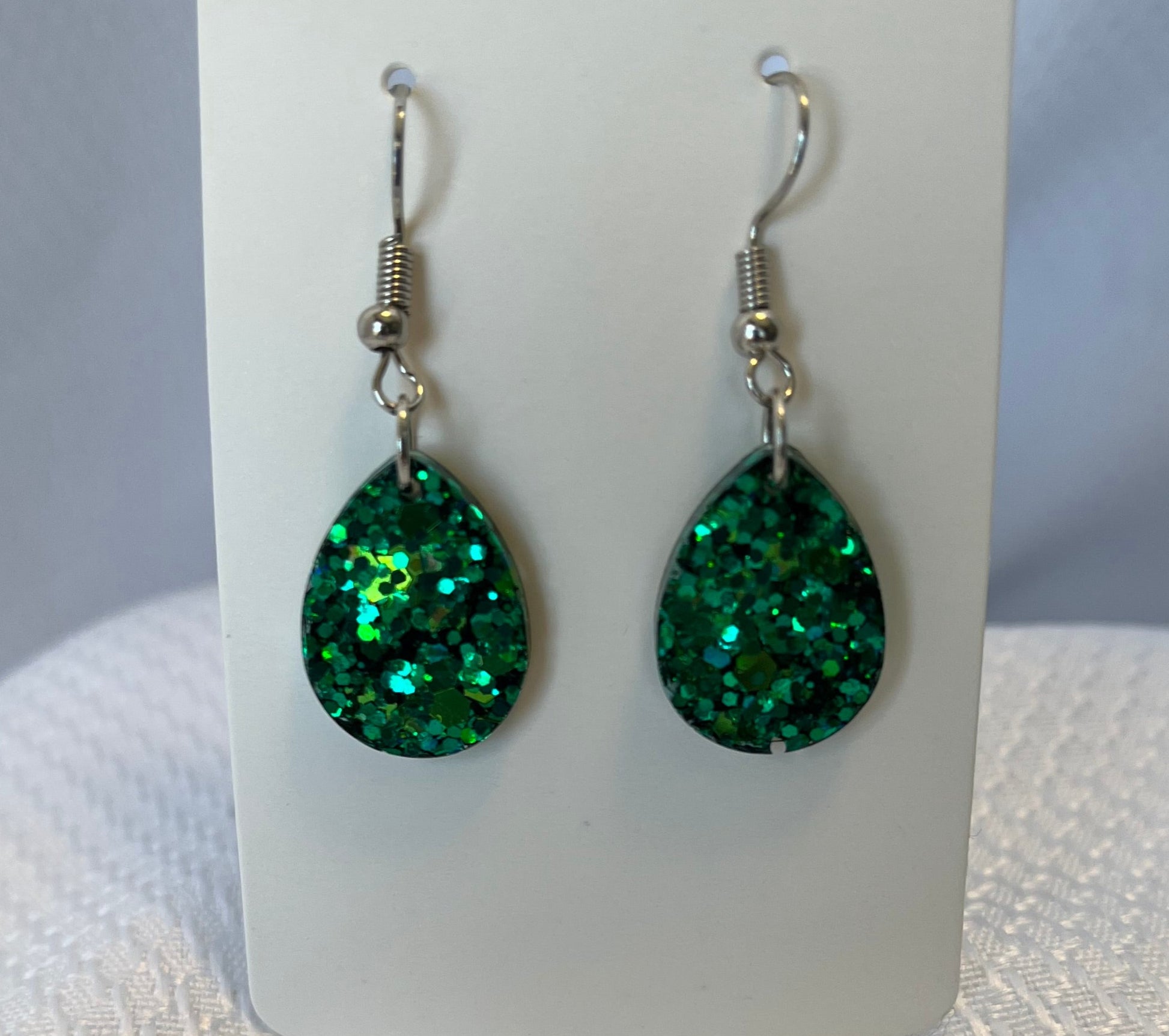 If you love green, you will love these earrings. They have a beautiful mix of light green and dark green glitter. Made with resin, glitter, and hypoallergenic stainless-steel hooks. Dimensions: Length 0.75", Width 0.5", and Total Drop Length with Hook 1.5".