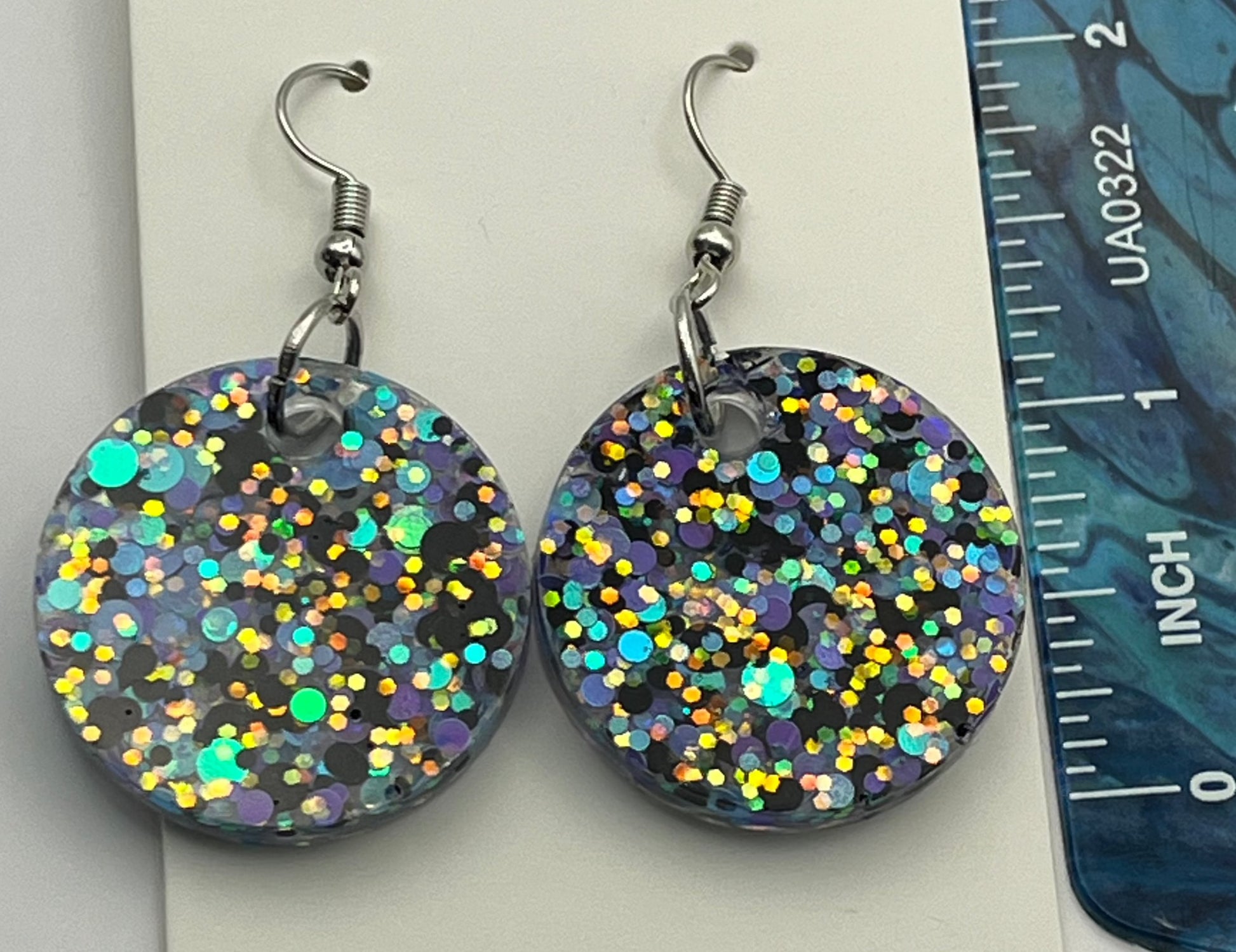 Medium circle earrings are made with an iridescent purple, light blue, and black glitter mix. Dimensions: Diameter 1" Total Drop Length with hook 2". They are made with resin, super cute red glitter mix, and hypoallergenic stainless steel hooks.
