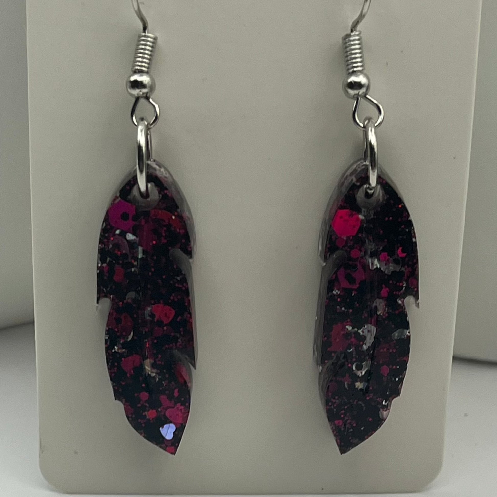 Check out these beautiful earrings: medium feathers with a base of black glitter and a sprinkle of pink and silver hearts. They are a great size, not too big, not too small. Dimensions: Length 1.5" Width 0.5" Total Drop Length with hook 2.25". They are made with resin, super cute glitter mix, and nickel-free stainless-steel hooks.