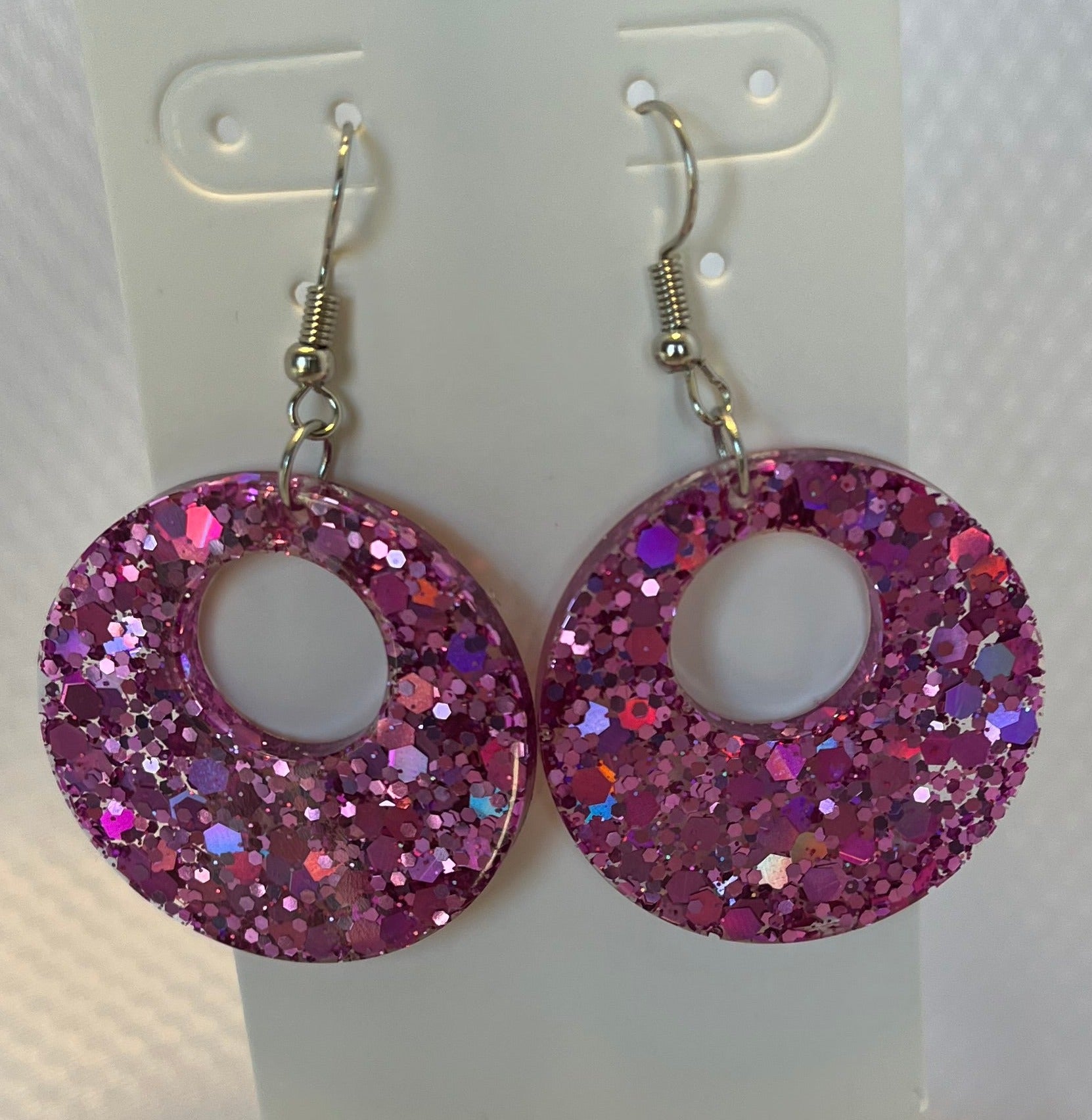 Very fun pink glitter mix, the colors sparkle so much. They are perfect for those that love a dangle earring that stands out in a crowd. It is such a fun glitter mix. Dimensions: Diameter 1.5", Total drop length with hook 2.25". They are made with resin, super cute glitter mix, and nickel-free stainless-steel hooks. Spoil yourself or a friend today!!!
