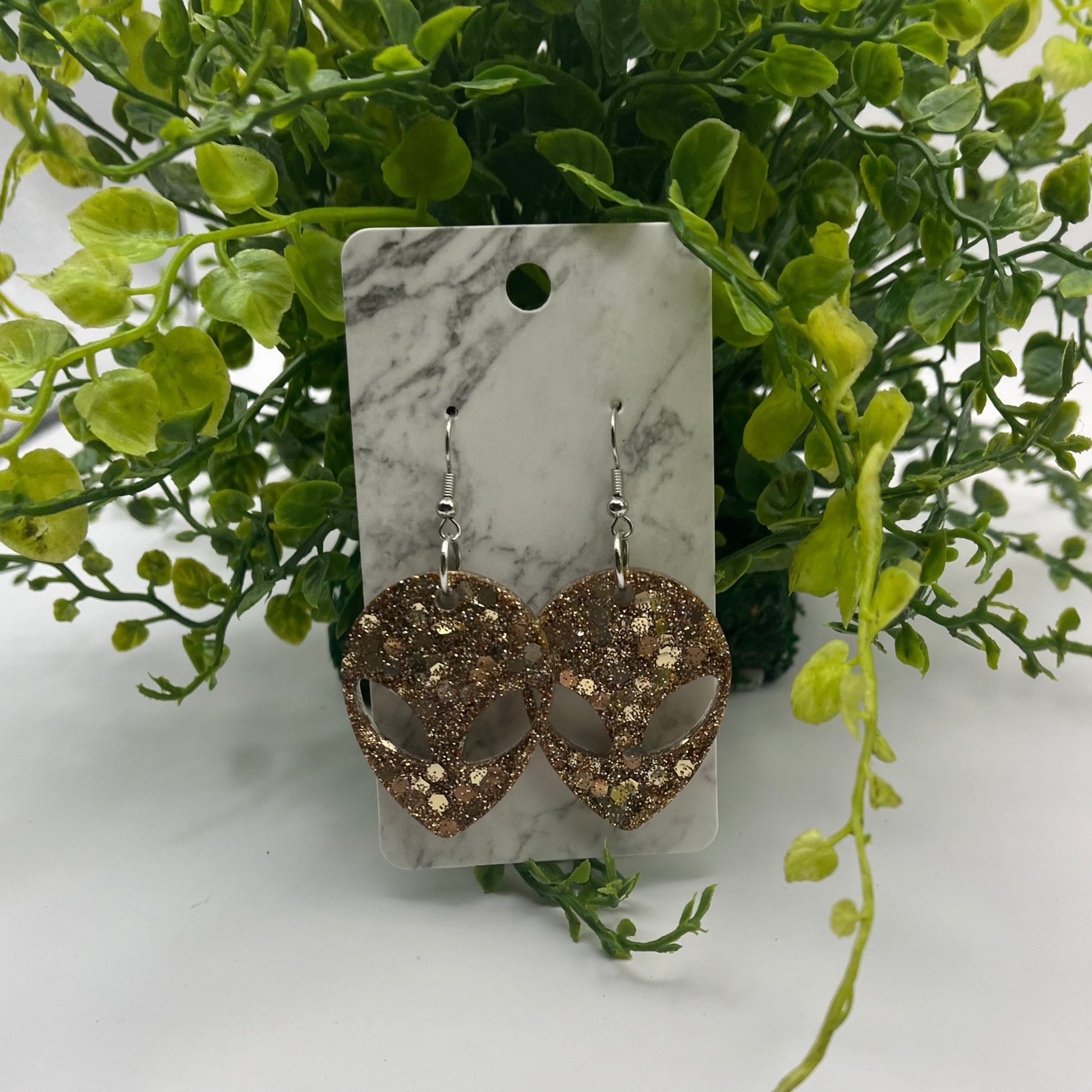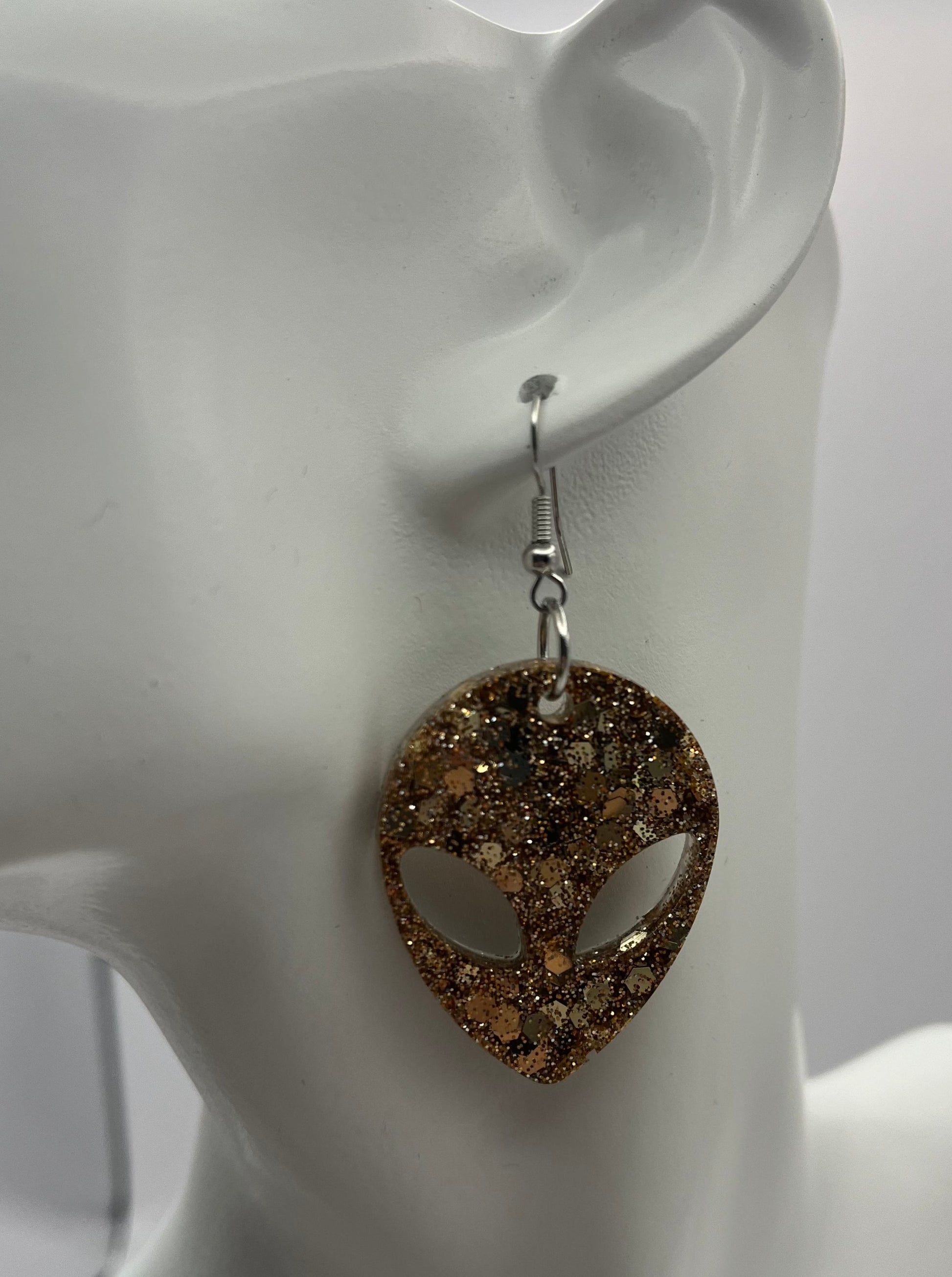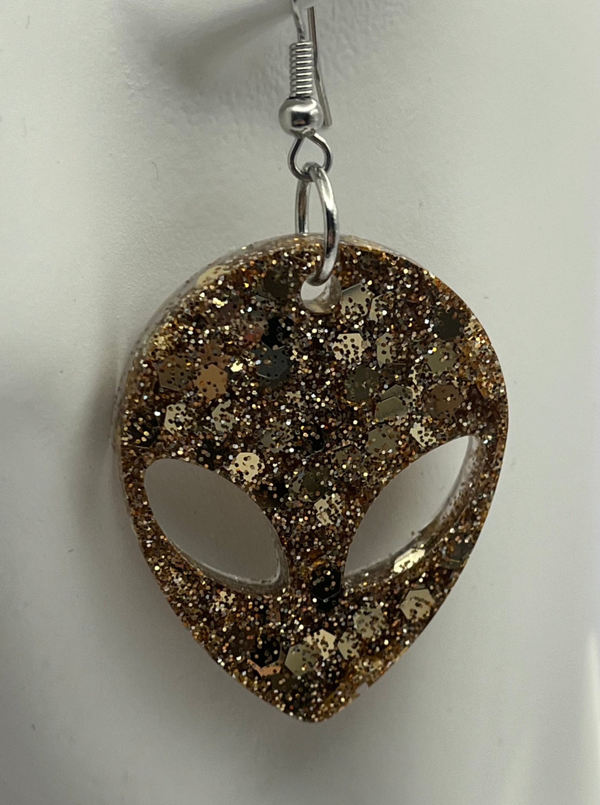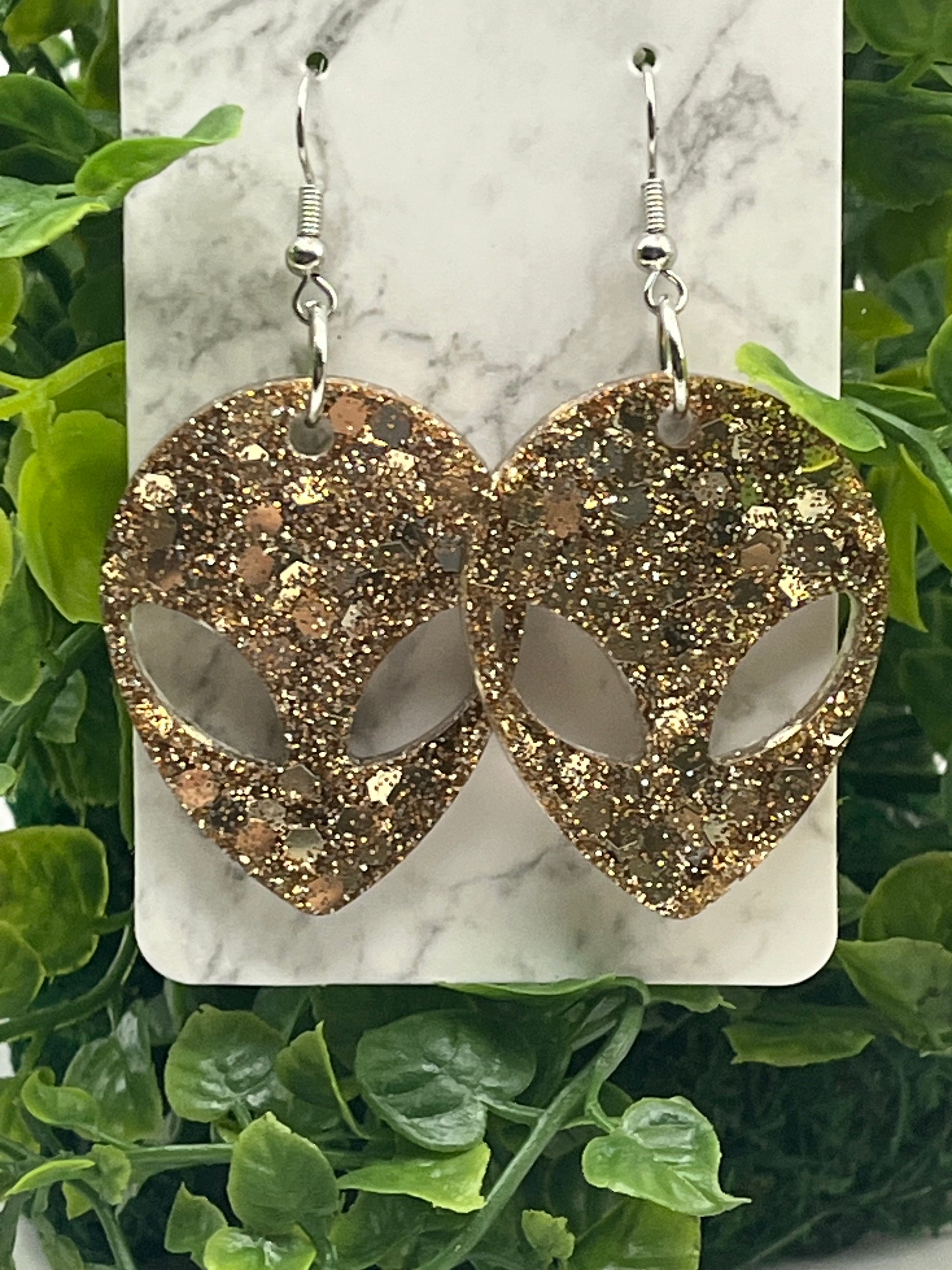 Check out these fun earrings: this rose gold glitter mix is sparkly and eye-catching. Dimensions: Length 1.5" Width 1.25" Total Drop Length with hook 2.25". They are made with resin, super cute glitter mix, and hypoallergenic stainless steel hooks.