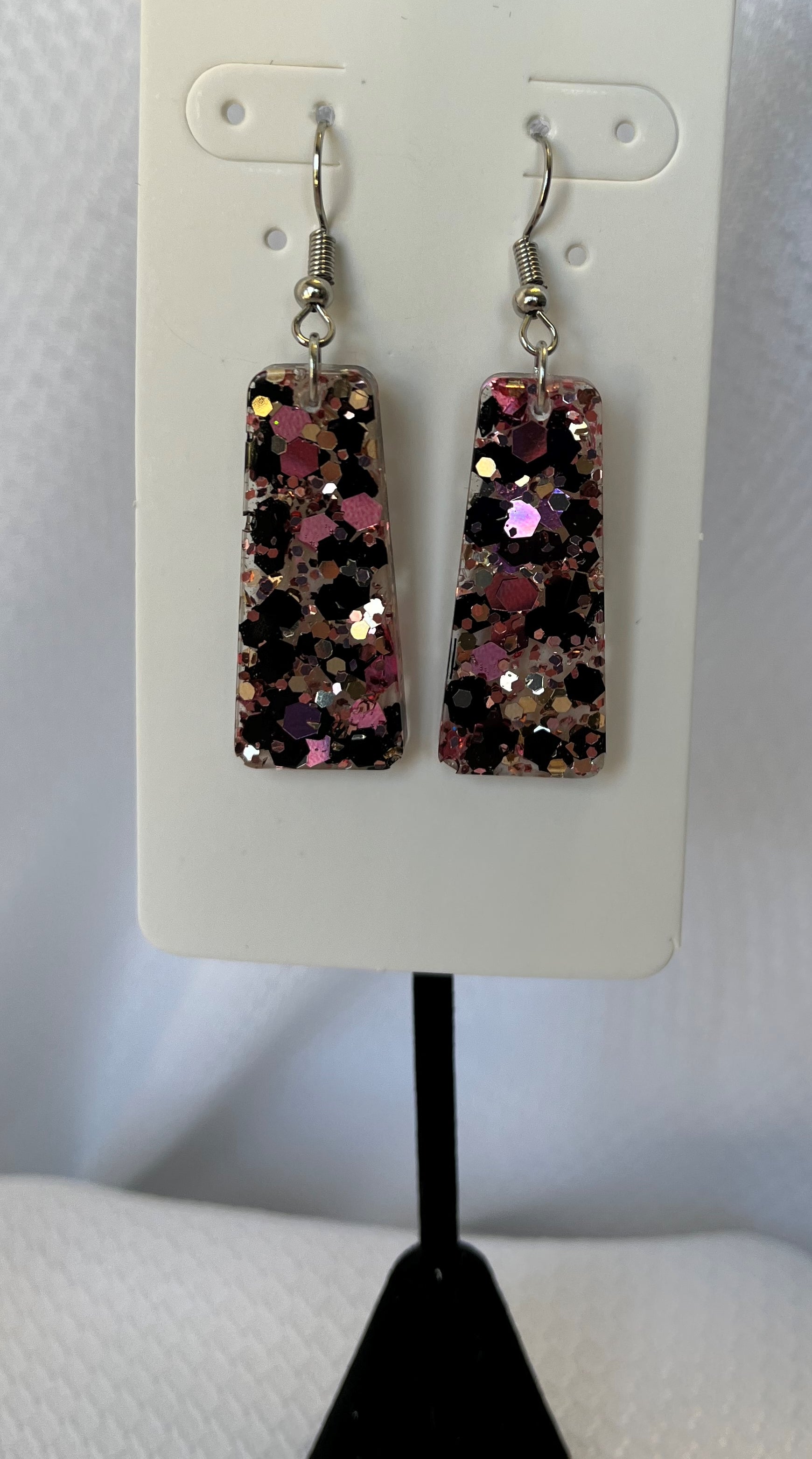 I love this combination of colors. They make a stunning pair of earrings. They are made with resin, glitter, and hypoallergenic stainless steel hooks. Dimensions: Length 1.25", Width 0.5", and Total Drop Length with Hook 2.25". Spoil yourself or a friend with a pair of earrings that they will love!!!