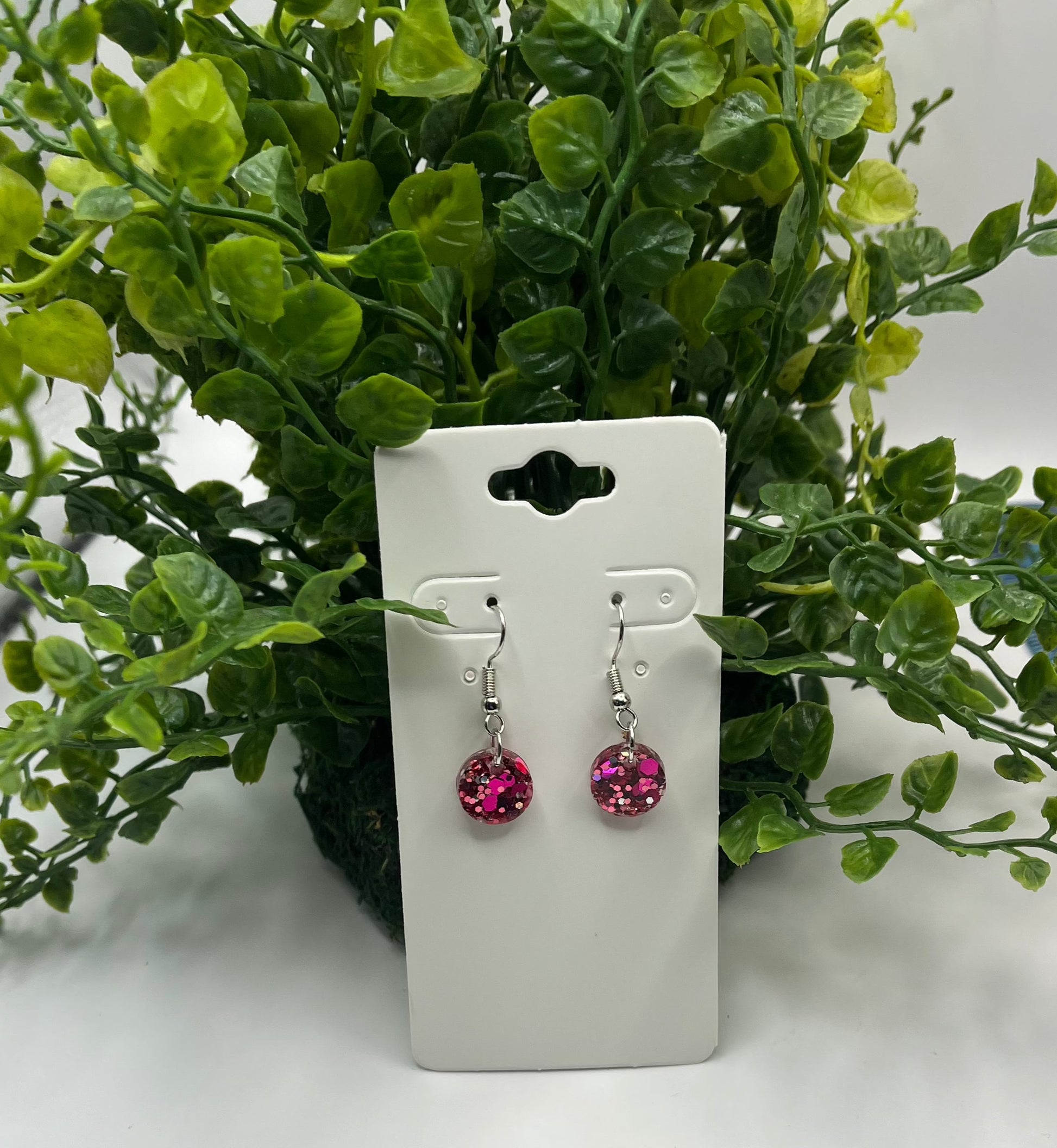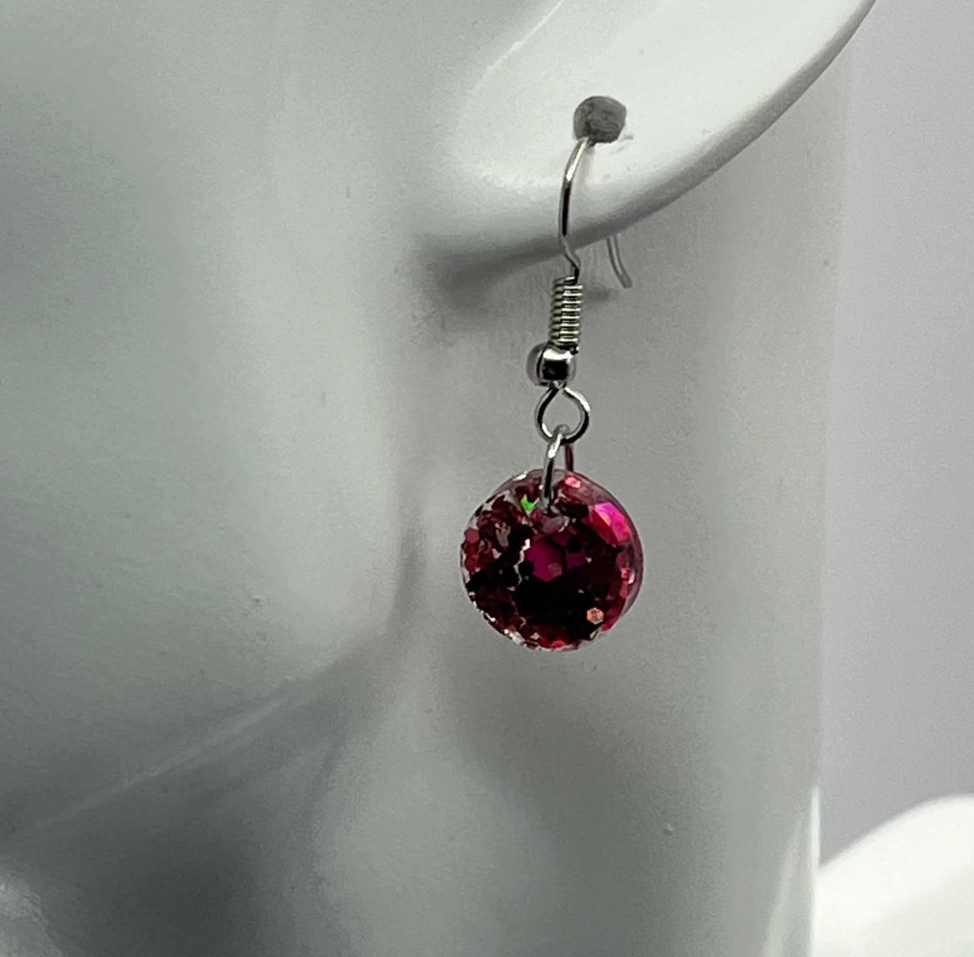 These small circle earrings are such a fun pink color with a little hint of silver. Made with resin, glitter, and hypoallergenic stainless steel hooks. Dimensions: Length 0.75", Width 0.75", and Total Drop Length with Hook 1.5".