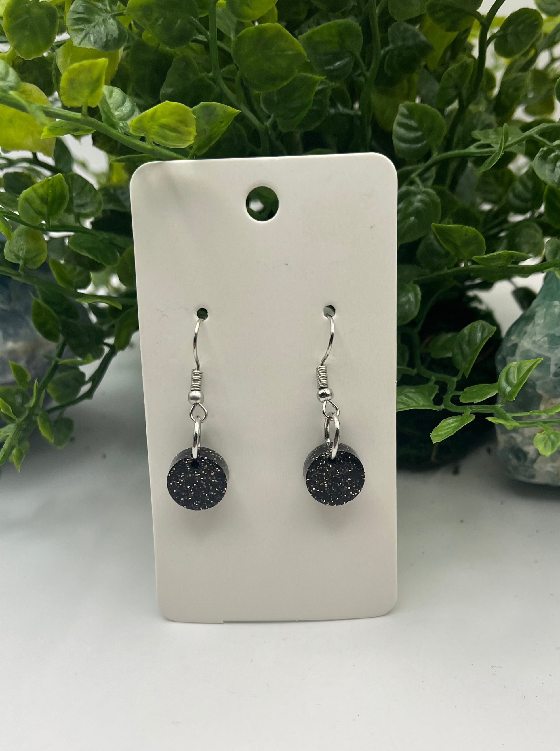 Adorable small circle earrings. They are made with a black base glitter, with a sprinkle of gold glitter. Dimensions: Diameter 0.5", and Total Drop Length with Hook 1.5". Made with resin, glitter, and hypoallergenic stainless steel hooks.
