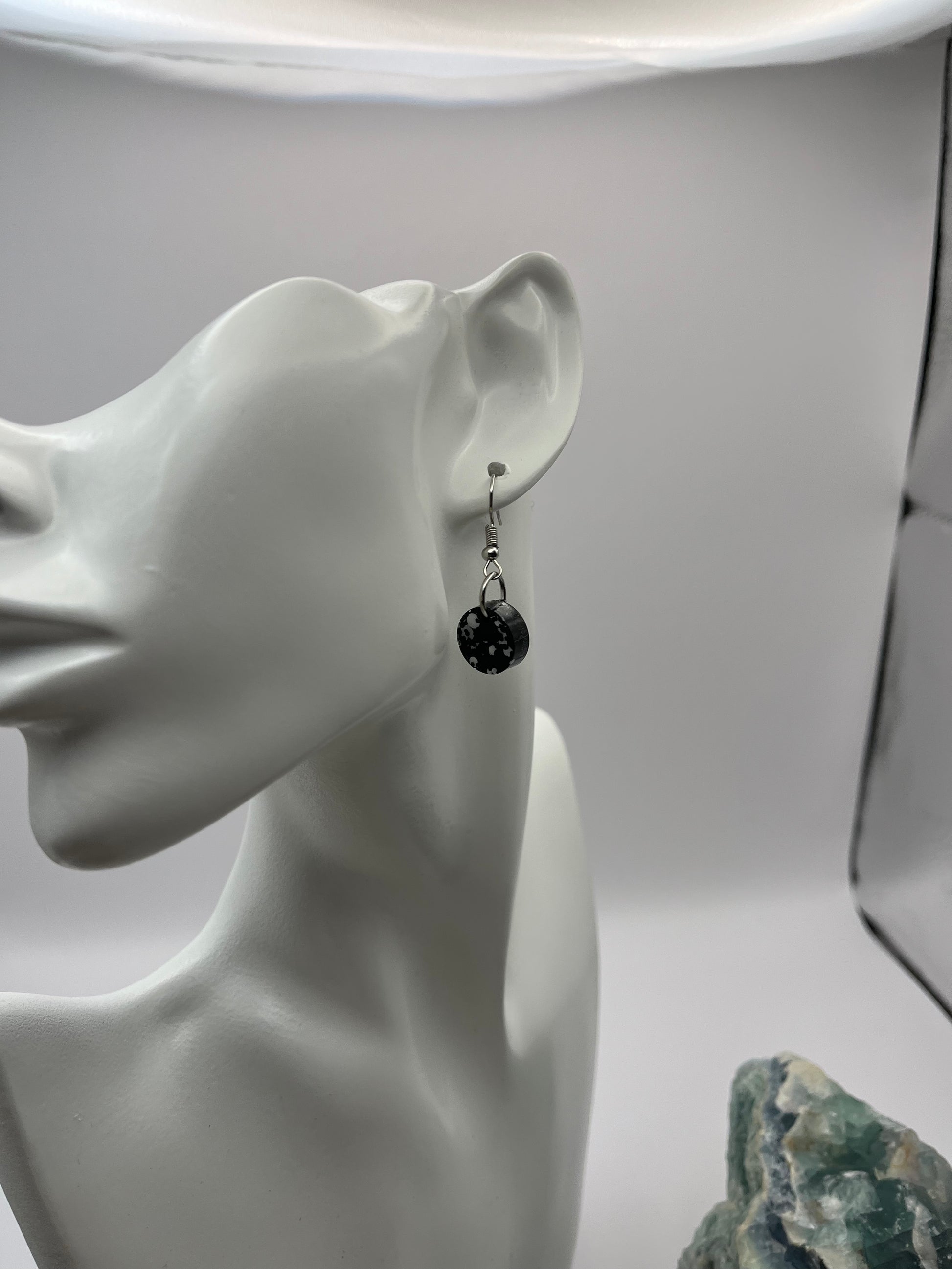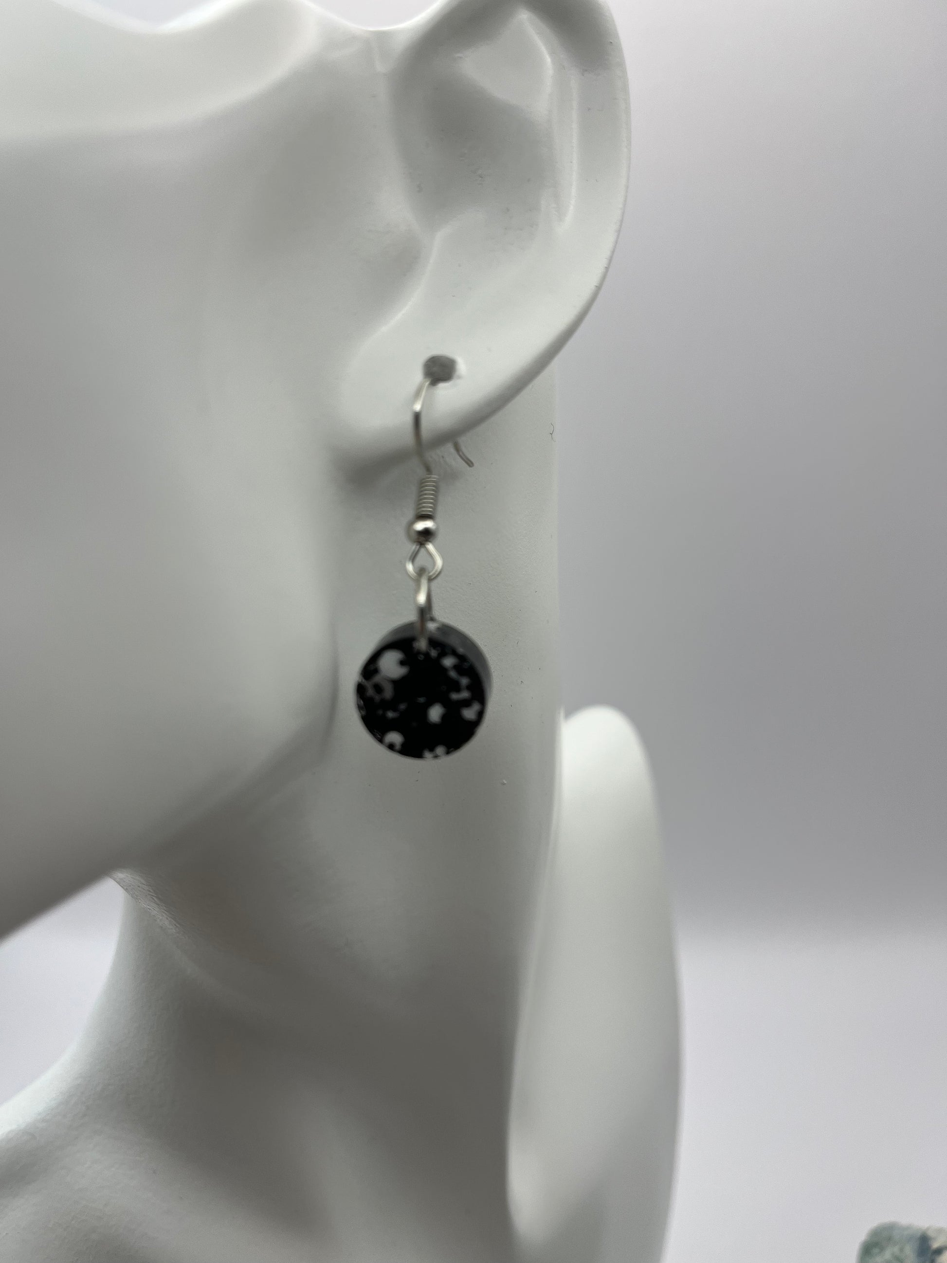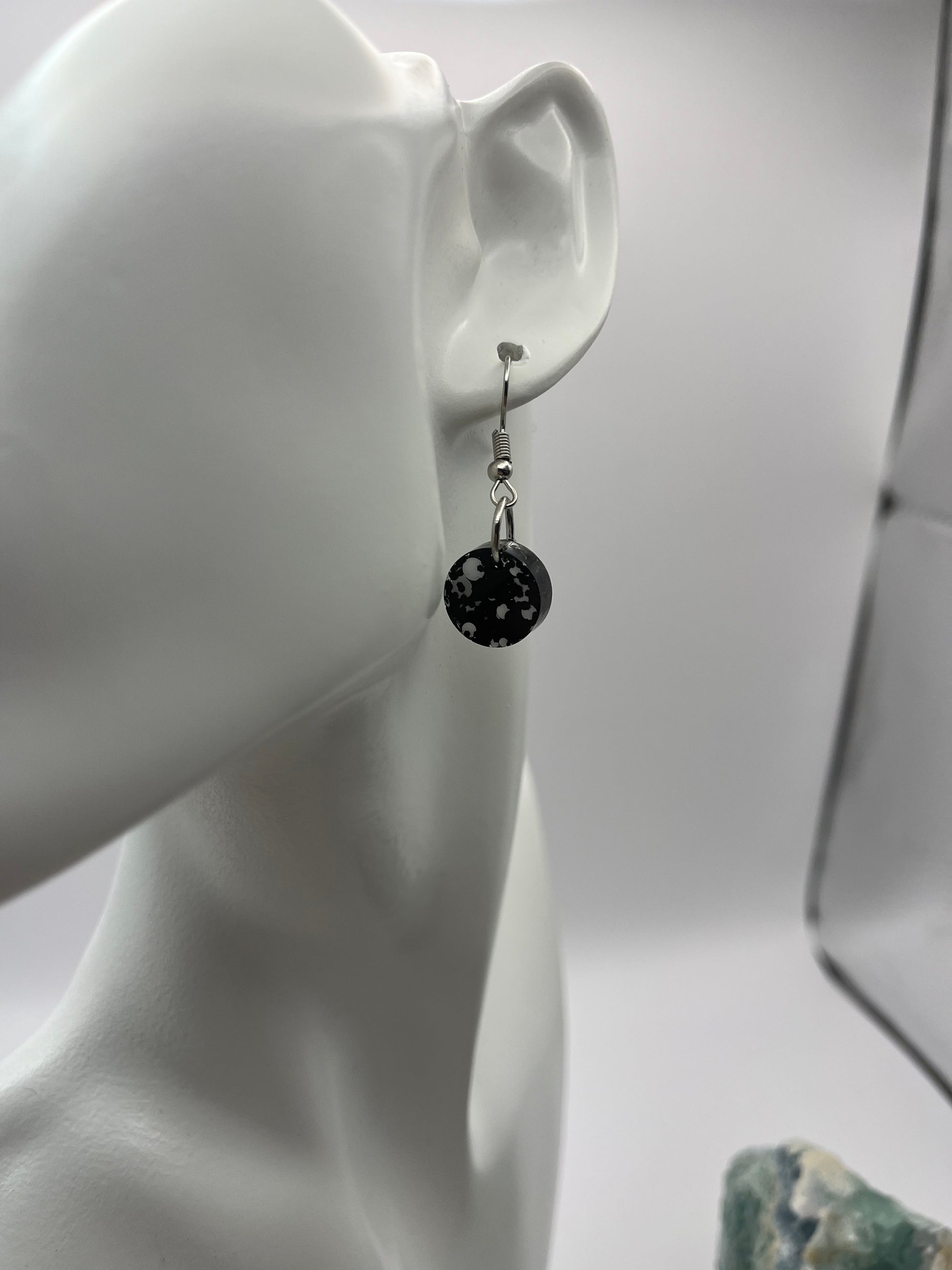 Cute small circle earrings. They are a black base color with a sprinkle of white glitter. Dimensions: Diameter 0.5", and Total Drop Length with Hook 1.5". Made with resin, glitter, and hypoallergenic stainless steel hooks.