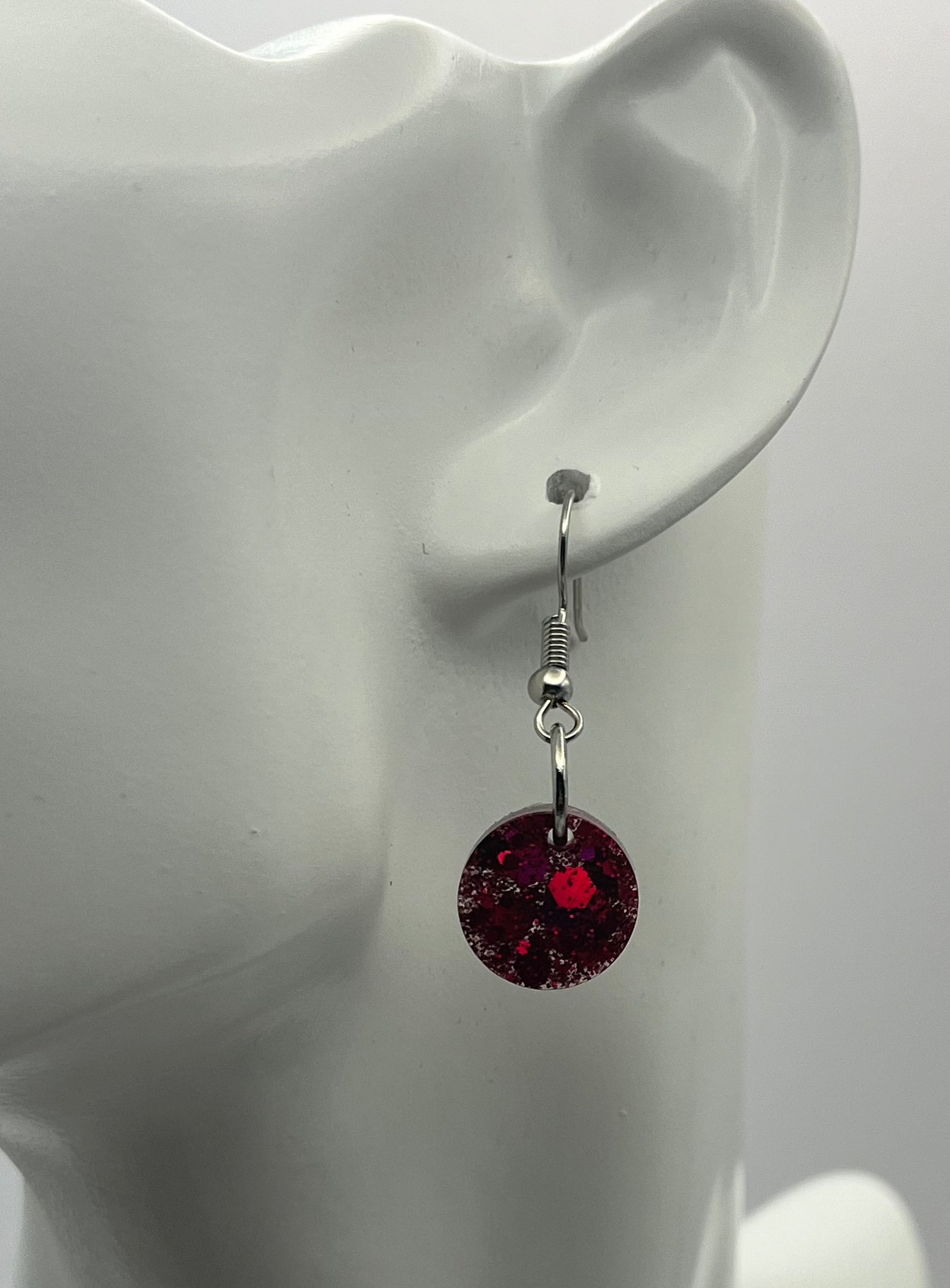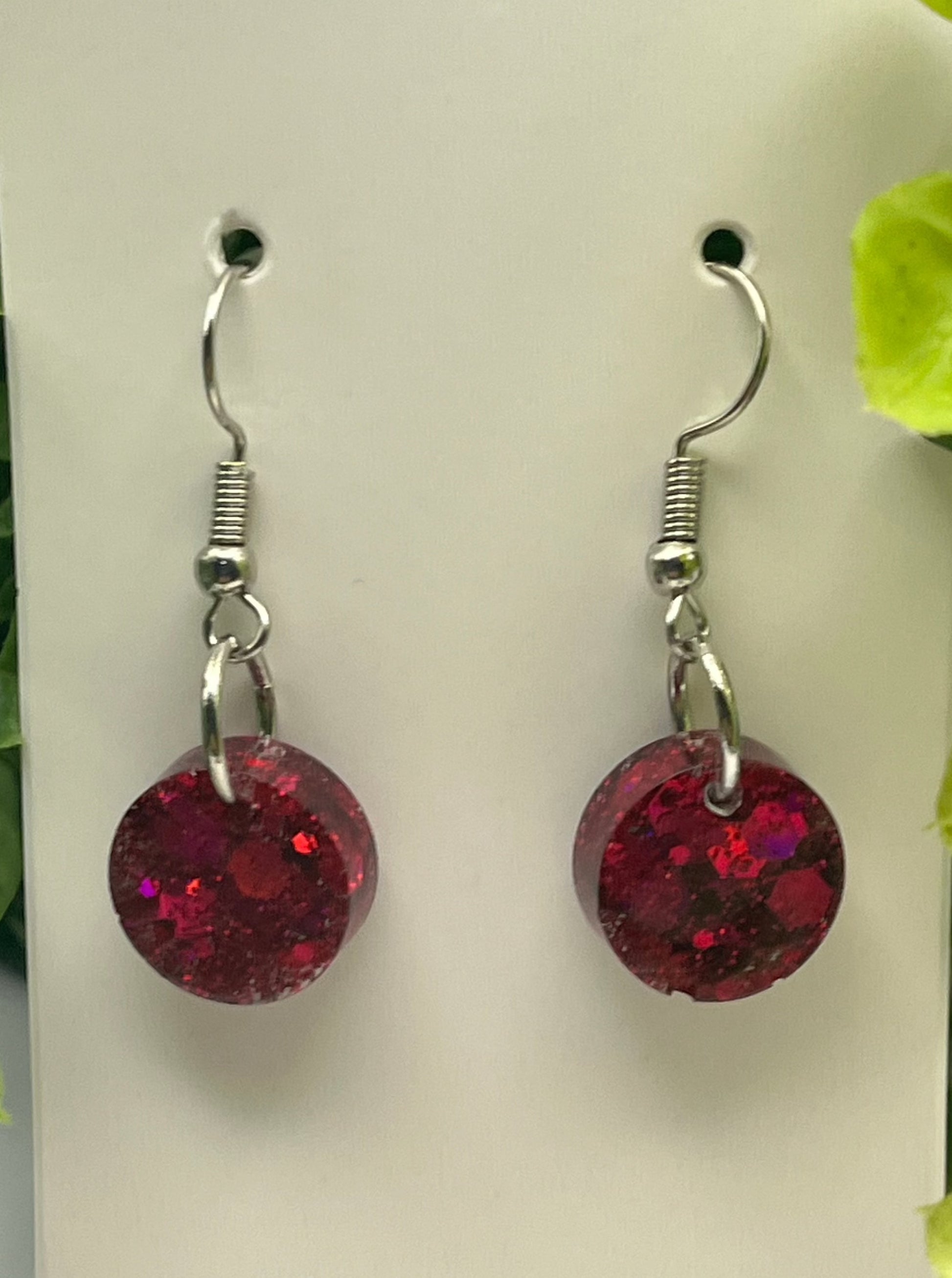 Cute small circle earrings. They are made from a very beautiful chunky magenta glitter mix. Dimensions: Diameter 0.5", and Total Drop Length with Hook 1.5". Spoil yourself with a pair of earrings that you will love. They go great with any outfit, very versatile. Made with resin, glitter, and hypoallergenic stainless steel hooks.