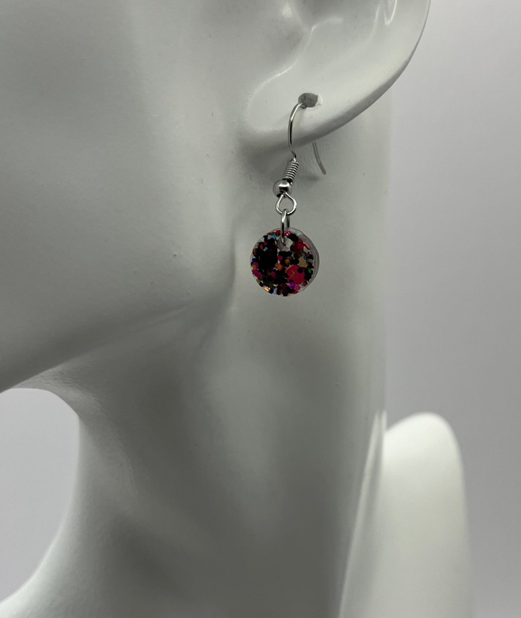 These small circle earrings are such a fun, they are created with a black, pink, and gold glitter mix. Made with resin, glitter, and hypoallergenic stainless steel hooks. Dimensions: Length 0.75", Width 0.75", and Total Drop Length with Hook 1.5".