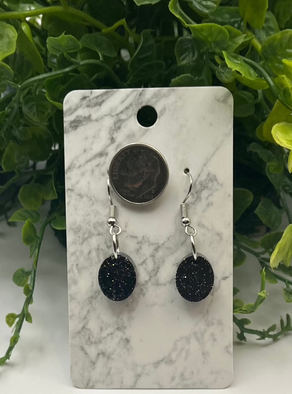 Small oval earrings with a base color of black and a sprinkle of gold glitter. Made with resin, glitter, and hypoallergenic stainless-steel hooks. Dimensions: Length 0.5", Width 0.35", and Total Drop Length with Hook 1.5".