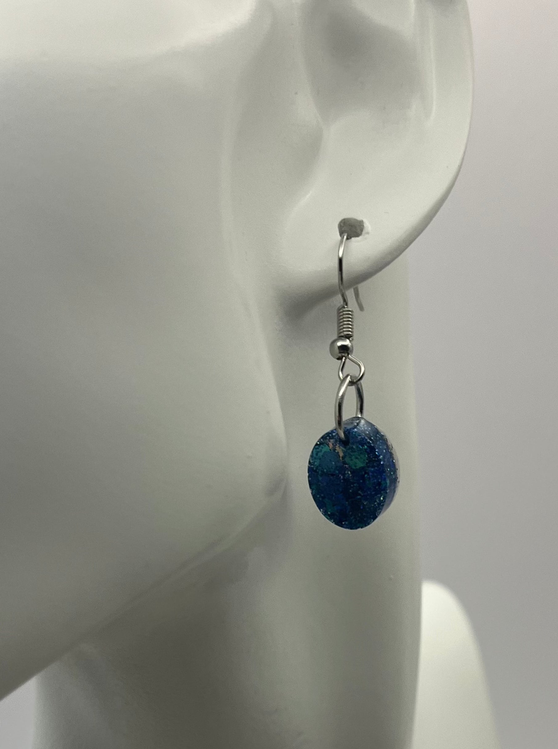 Small oval earrings made with a beautiful blue chunky glitter. Made with resin, glitter, and hypoallergenic stainless-steel hooks. Dimensions: Length 0.5", Width 0.35", and Total Drop Length with Hook 1.5".