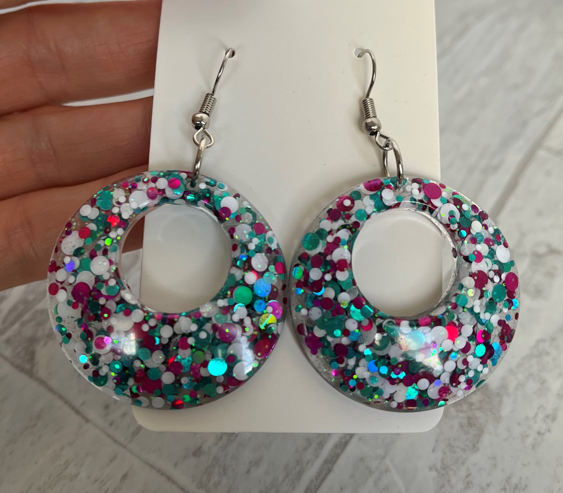 These earrings are perfect for those that love a dangle earring that stands out in a crowd. It is such a fun glitter mix. Dimensions: Length 1.5" Width 1.5" Total Drop Length with hook 2.5. They are made with resin, super cute glitter mix, and nickel-free stainless-steel hooks. They will not disappoint.